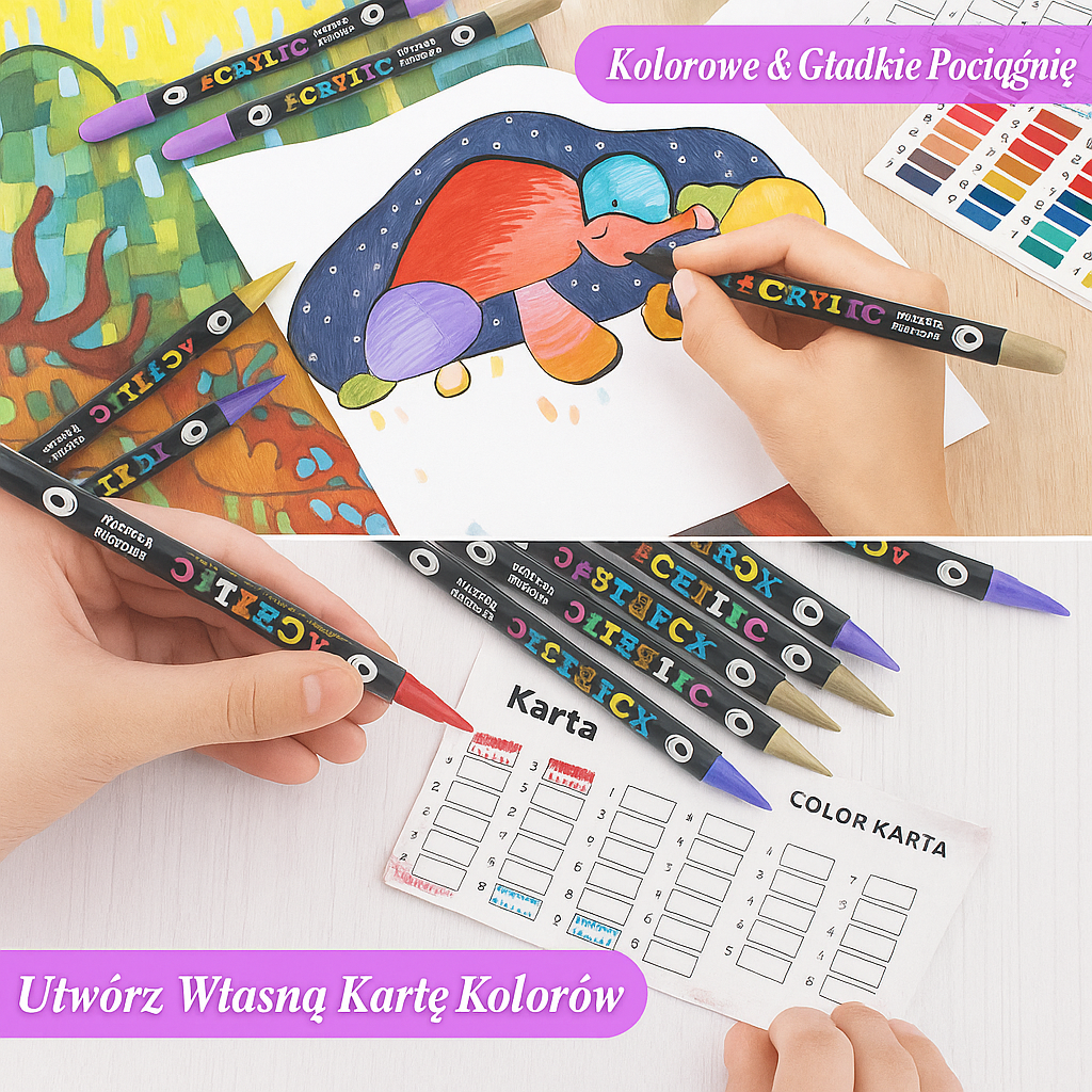 Ożyw swoje dzieła sztuki dzięki 72 starannie dobranym, intensywnie nasyconym kolorom! Ten zestaw markerów akrylowych obejmuje żywe barwy podstawowe, odcienie uzupełniające oraz 12 olśniewających kolorów metalicznych. Metaliczne markery zapewniają efekt lustrzanego połysku, dodając Twoim projektom blasku i głębi. To paleta, która pozwoli Ci tworzyć profesjonalne i pełne energii prace, niezależnie od tego, czy jesteś artystą, hobbystą czy początkującym twórcą.