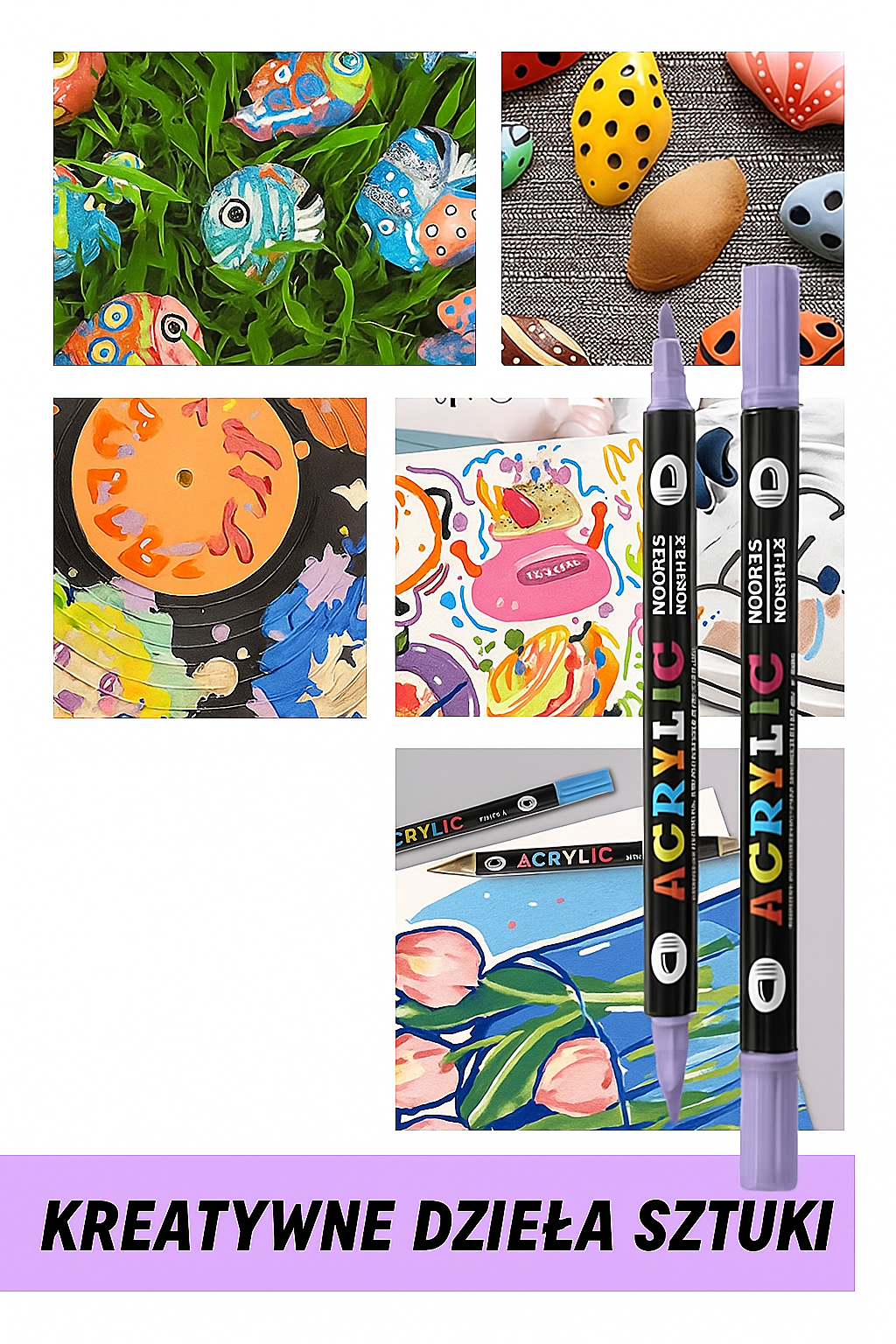 Każdy marker został zaprojektowany z myślą o uniwersalności i komforcie użytkowania. Innowacyjna podwójna końcówka pozwala na łatwe przełączanie między cienką końcówką do detali a grubą do wypełniania większych powierzchni i tworzenia wyrazistych pociągnięć. Wysokiej jakości tusz akrylowy doskonale przylega do niemal każdej powierzchni – kamienia, drewna, płótna, szkła, ceramiki i wielu innych. Dzięki temu możesz tworzyć bez ograniczeń i bez kompromisów.