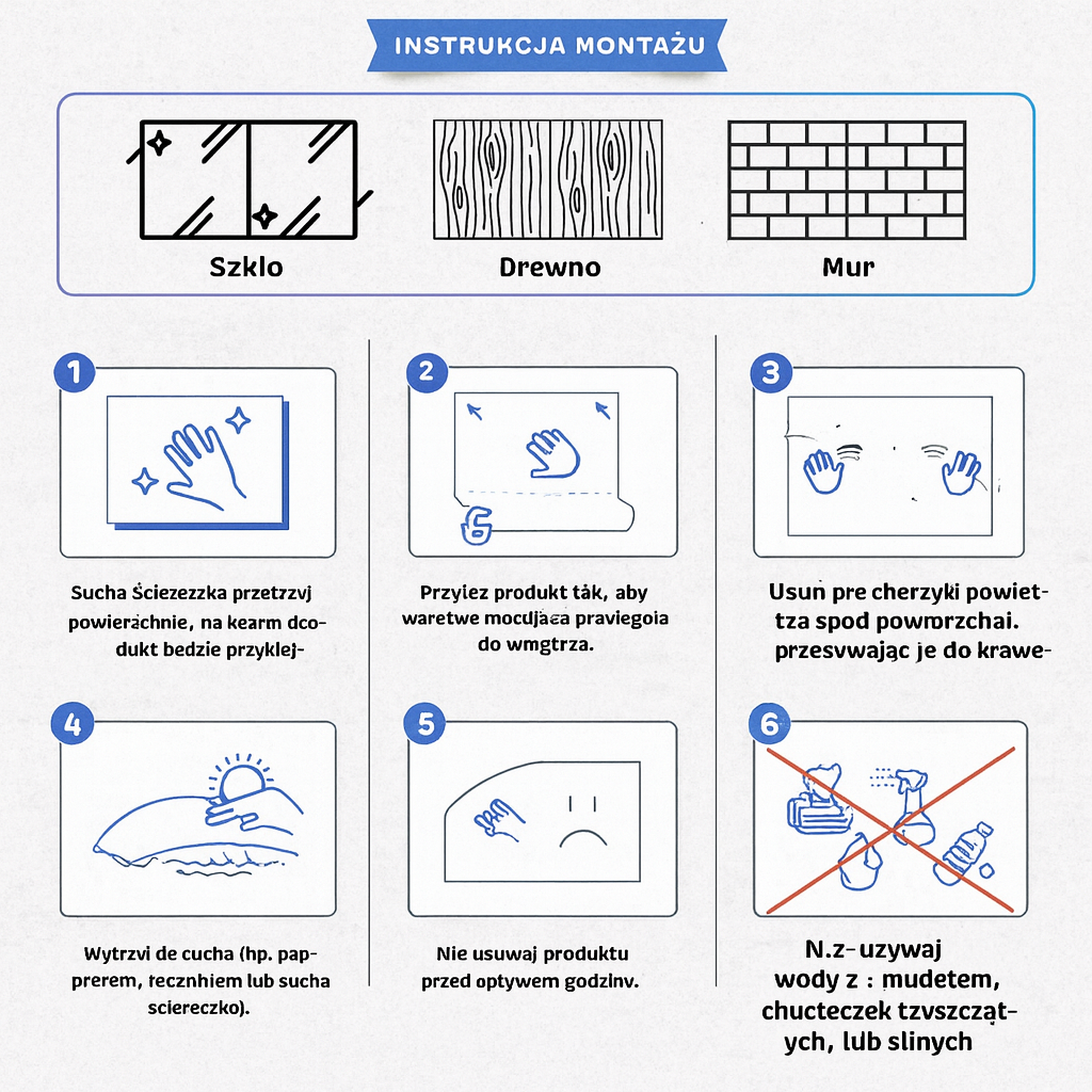 Mocowanie: Elektrostatyczne – bez kleju, łatwe do przyklejenia, przenoszenia i zdejmowania bez śladów